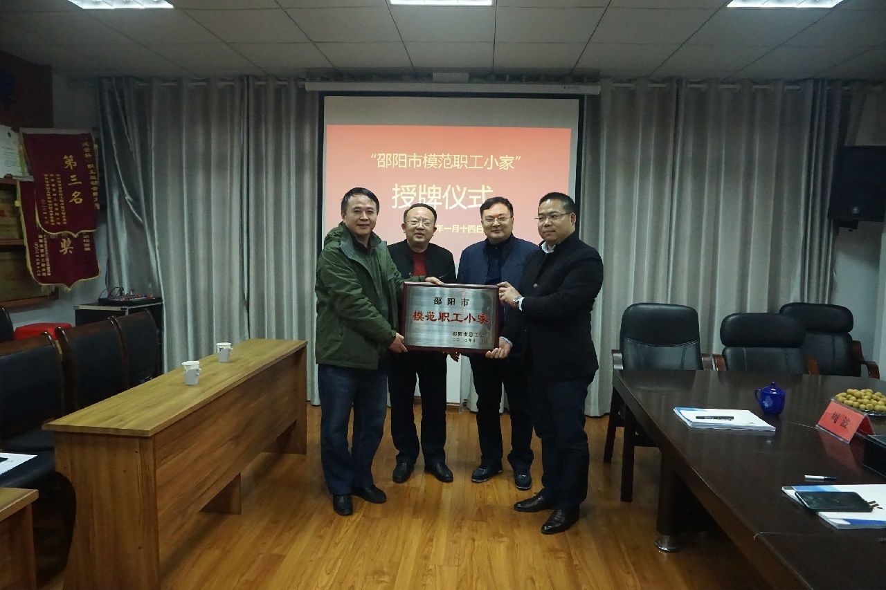 1月14日下午,邵阳市总工会党组成员、副主席赵比特一行到我司举行“邵阳市模范职工小家”授牌仪式。湖南省第四工程有限公司党委委员、副总经理艾铁牛及相关单位人员出席授牌仪式。