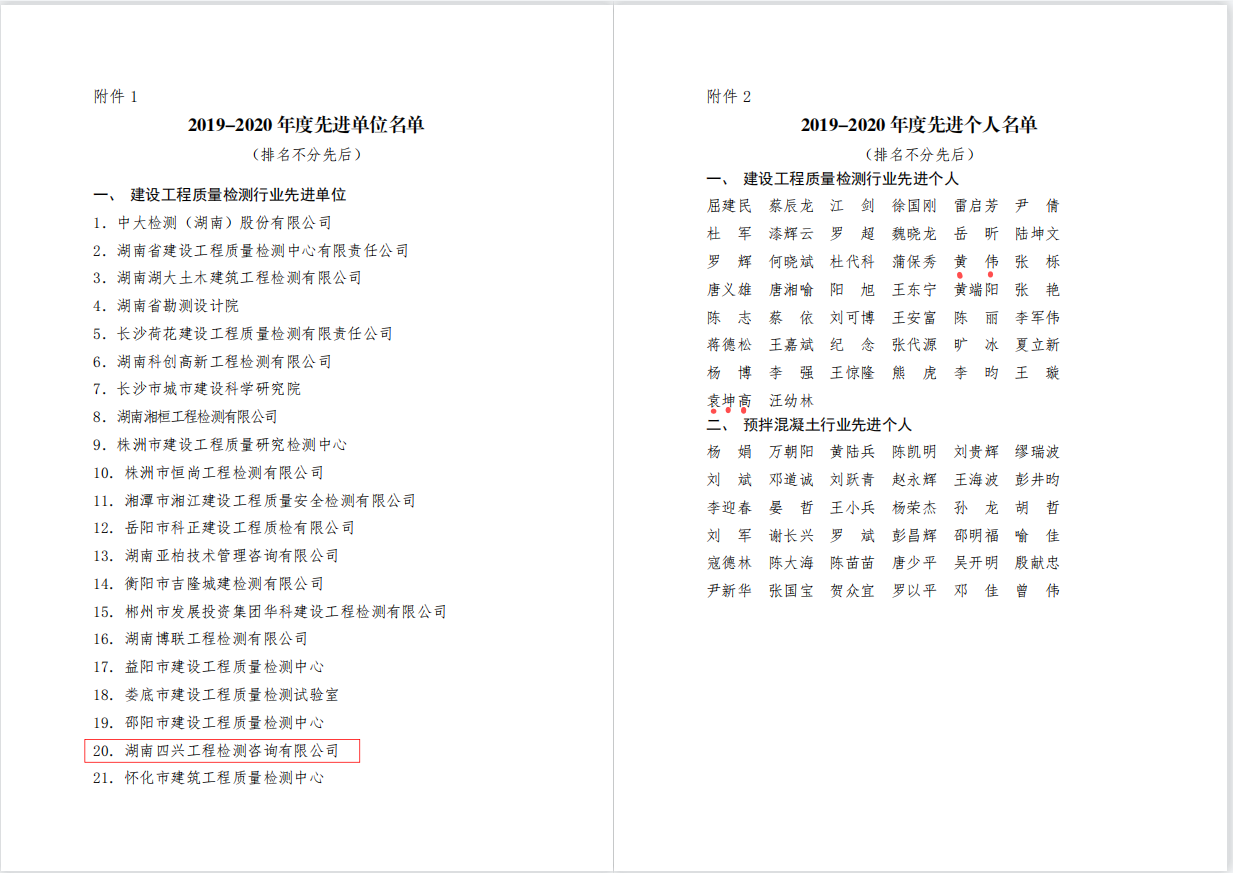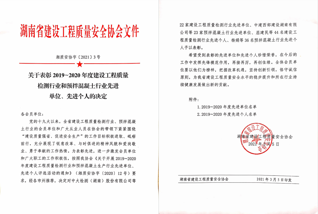 (通讯员 周艳芳 李慧敏)3月5日,湖南省质量安全协会发布了《关于表彰2019~2020年度建设工程质量检测行业和预拌混凝土行业先进单位、先进个人的决定》,我公司获“2019-2020年度建设工程质量检测行业先进单位”荣誉称号,公司黄伟、袁坤高两位同志获“湖南省建设工程质量检测行业先进个人”荣誉称号。